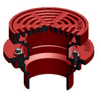 MIFAB® F1300-C Series lacquered cast iron floor drain with anchor flange, cast iron clamp ring with primary and secondary weepholes for waterproofing membrane, and standard 1″ (25) thick, 7″ (178) round, ductile iron tractor grate.