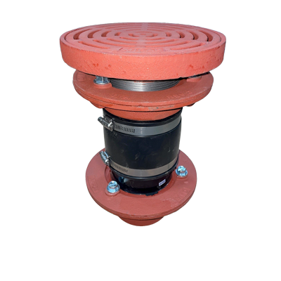MIFAB® F1620-C Series lacquered cast iron floor drain with upper and lower bodies and anchor flanges, cast iron membrane clamp rings with primary and secondary weepholes for waterproofing membrane, neoprene expansion compensator, and standard 1” (25) thick, 9” (229) round, tractor grate.