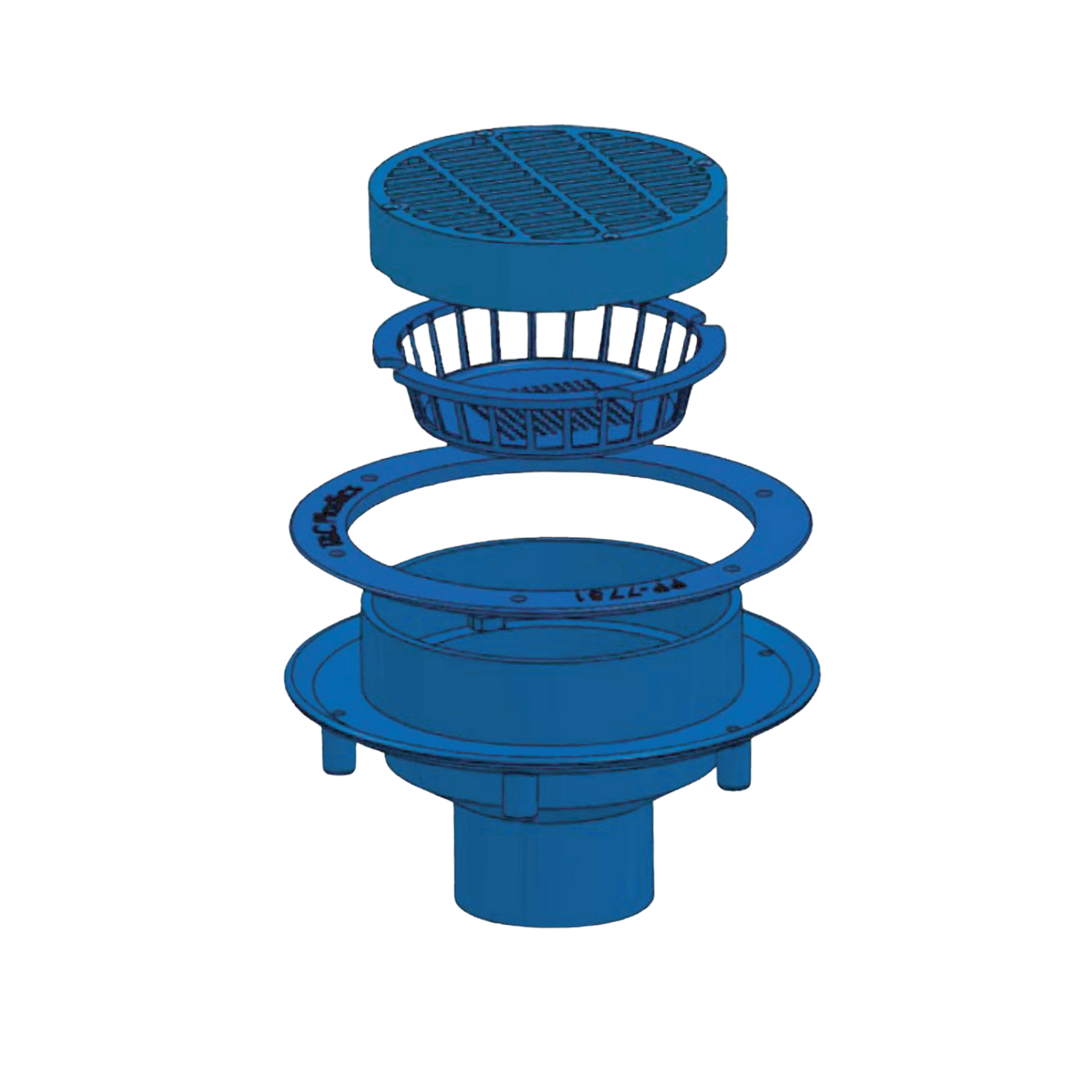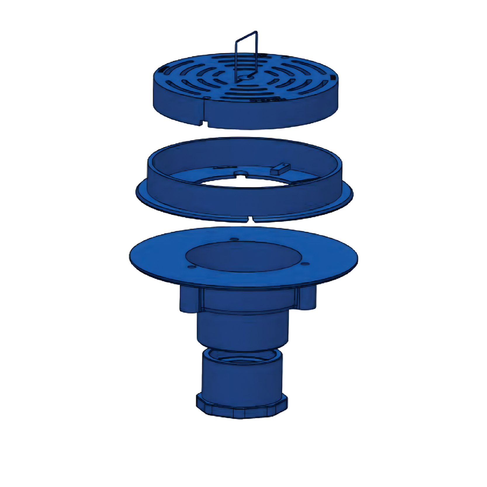 MIFAB® floor drain manufactured out of flame retardant polypropylene body with bottom outlet, polypropylene membrane clamp, and heavy duty load rated (5,000 lb.- 7,499 lbs.) 8” diameter slotted grate.